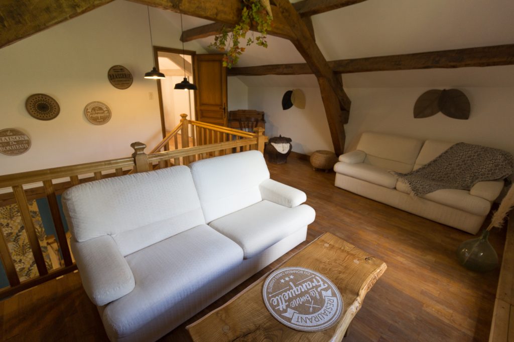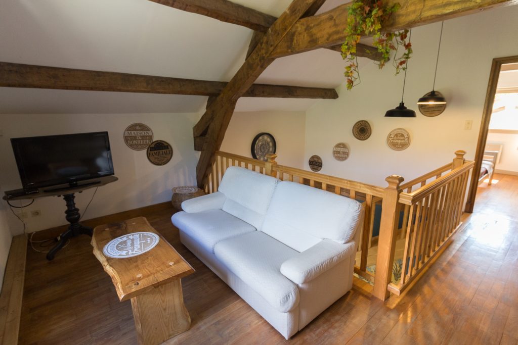 - Un salon en mezzanine : deux canapés, une table basse, une télévision